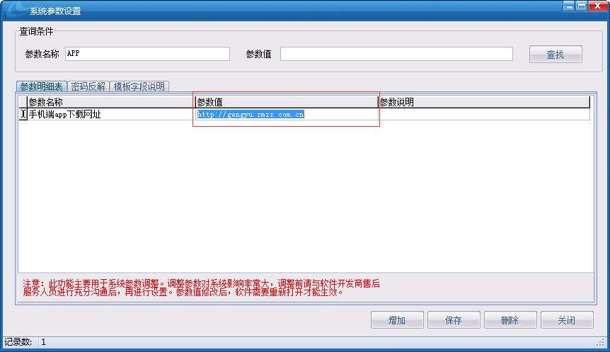 2、在【系統(tǒng)參數(shù)設(shè)置】中通過系統(tǒng)名稱查找到參數(shù)名稱是【手機(jī)端APP下載地址】