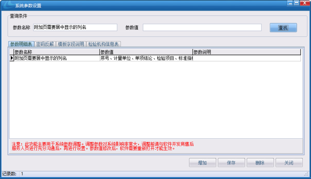 如果我們想要附加頁里面的參數內容居中顯示,我們可以登錄管理員用戶,在系統維護中的系統參數設置里面找到【附加頁需要居中顯示的列名】這個參數名,然后在后面的參數值輸入要居中的參數名稱。