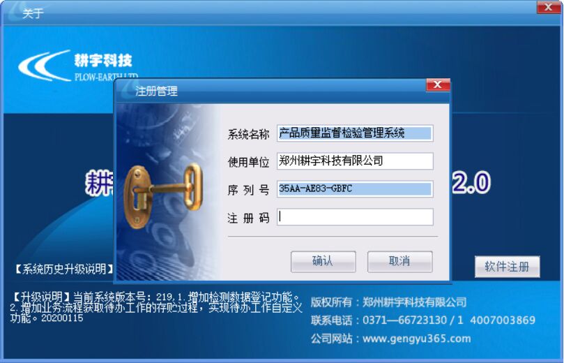 解決方案:我們要用系統(tǒng)管理員的的賬號(sys)進(jìn)行登錄,然后選擇【幫助】→【關(guān)于本系統(tǒng)】,點(diǎn)擊右下角的【注冊】,將序列號發(fā)送到耕宇售后的qq上,然后耕宇售后會將注冊碼發(fā)送過來,復(fù)制粘貼過來,然后點(diǎn)擊確認(rèn)即可。