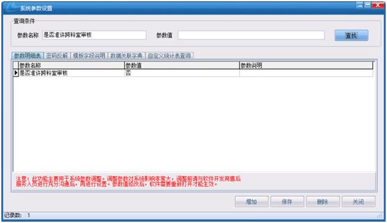 解決辦法:在【系統(tǒng)設(shè)置中心】中的【系統(tǒng)設(shè)置參數(shù)設(shè)置】中的【是否準(zhǔn)許跨科室審核】