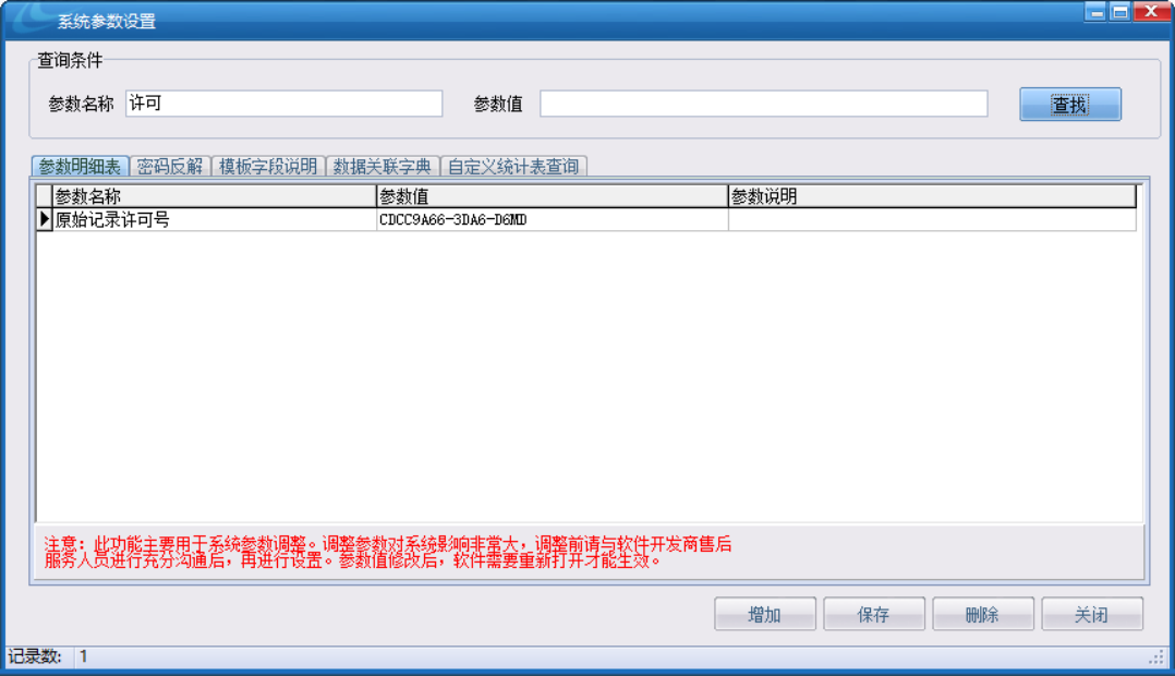 2.在系統(tǒng)參數(shù)設(shè)置中將耕宇售后給的許可證添加到如圖所示的參數(shù)值內(nèi),點(diǎn)擊確定,重啟系統(tǒng)后即可再增加模板。