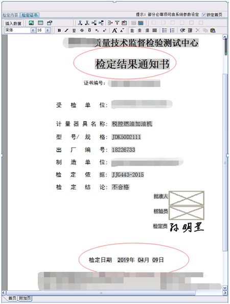 2、【最終結(jié)論】選擇不合格以后,系統(tǒng)會自動判定,檢定證書的首頁模板會變成【檢定結(jié)果通知書】,按常規(guī)編制報告,在證書中將檢定結(jié)果填寫。