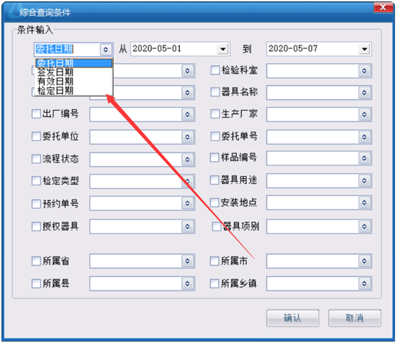 在條件選擇中可根據(jù)委托日期,簽發(fā)日期,有效日期,檢定日期進(jìn)行查詢。