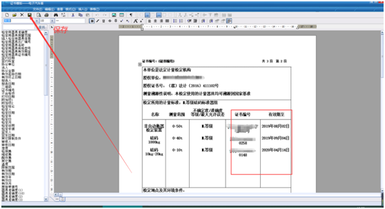 修改標(biāo)準(zhǔn)器的證書編號(hào)和有效期的信息,并點(diǎn)擊保存按鈕