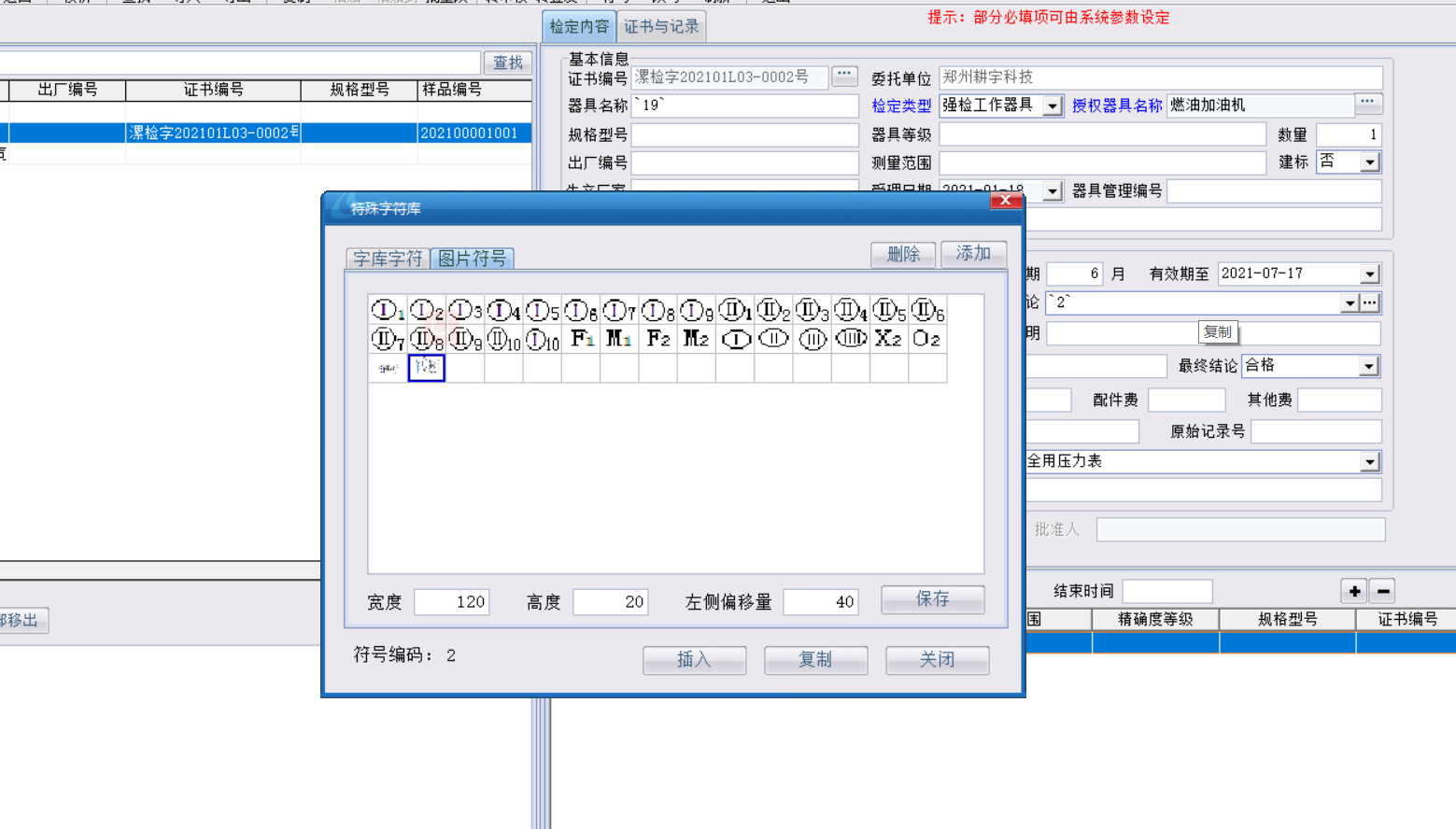 在證書編制【符號(hào)】那里插入特殊符號(hào)的時(shí)候符號(hào)的圖片大小每次都需要我們手工去調(diào)整,這次更新增加了符號(hào)圖片的